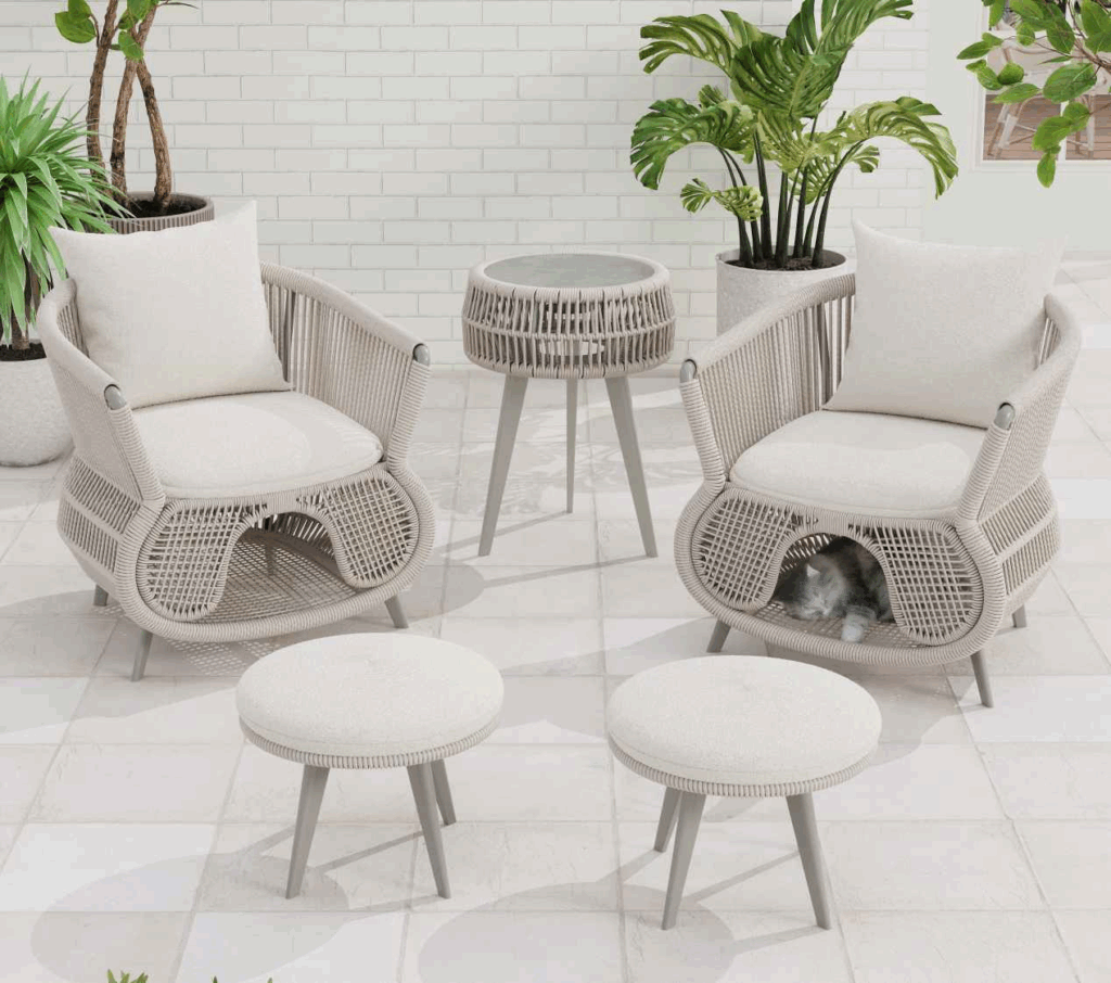 We use only premium, weather-resistant materials including powder-coated aluminum frames, Grade-A teak wood, and UV-resistant PE rattan or outdoor fabrics (like Sunbrella). Every piece undergoes rigorous quality control (QC) to ensure it withstands harsh outdoor environments while maintaining its luxury aesthetic.